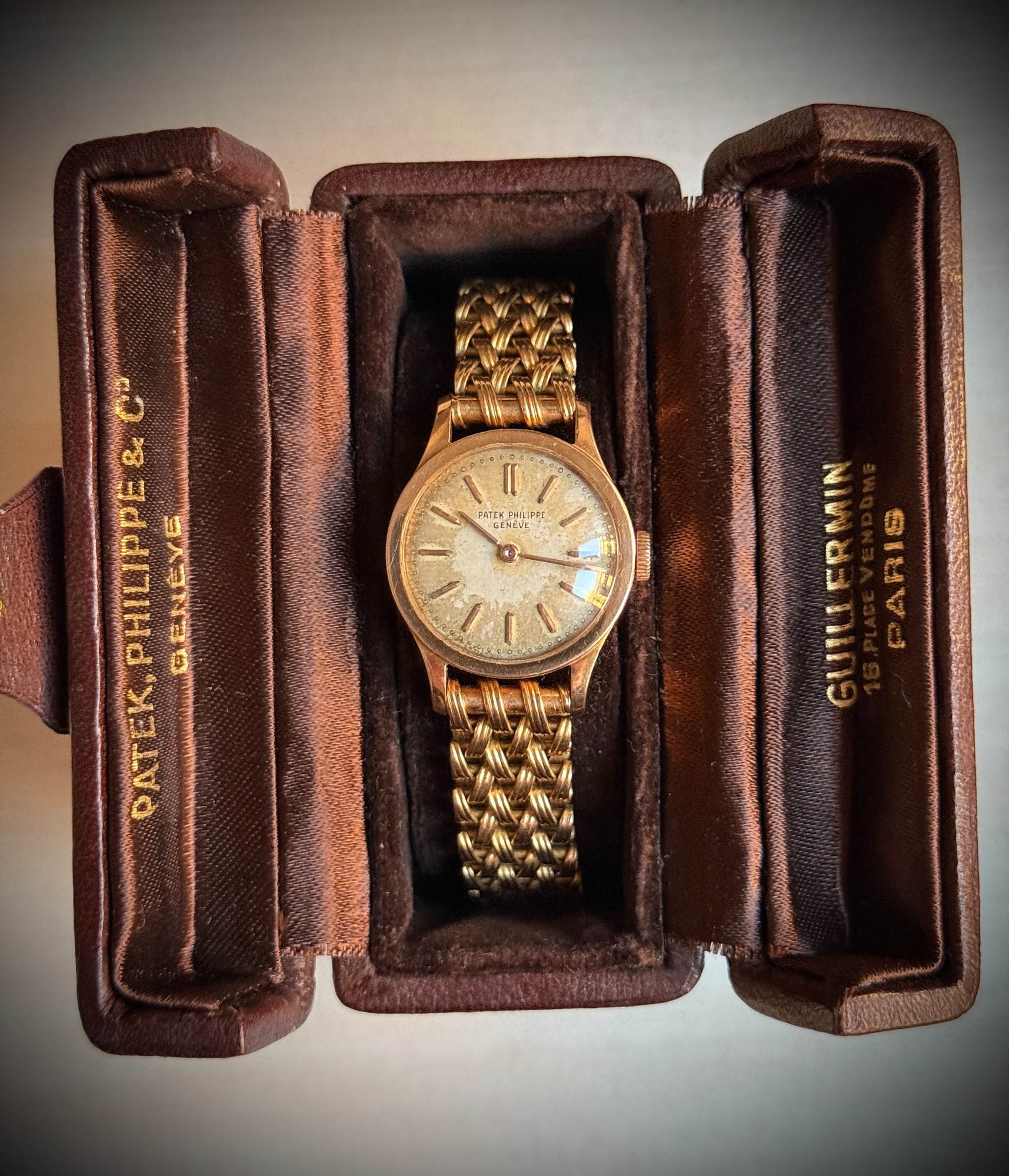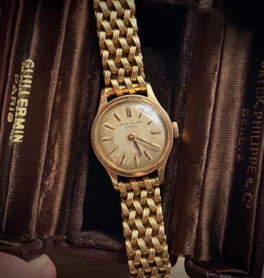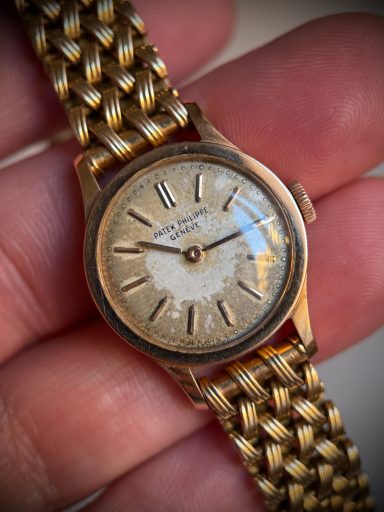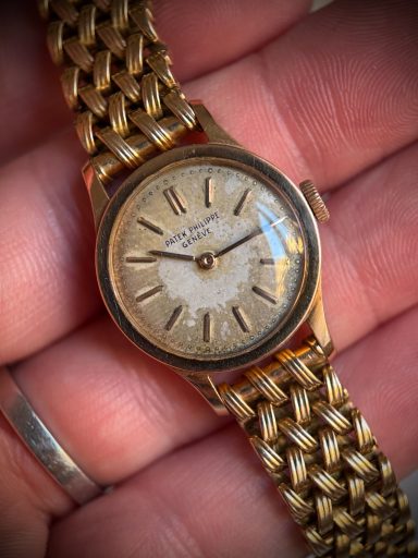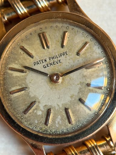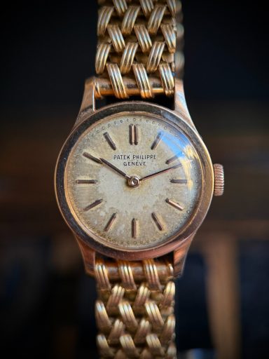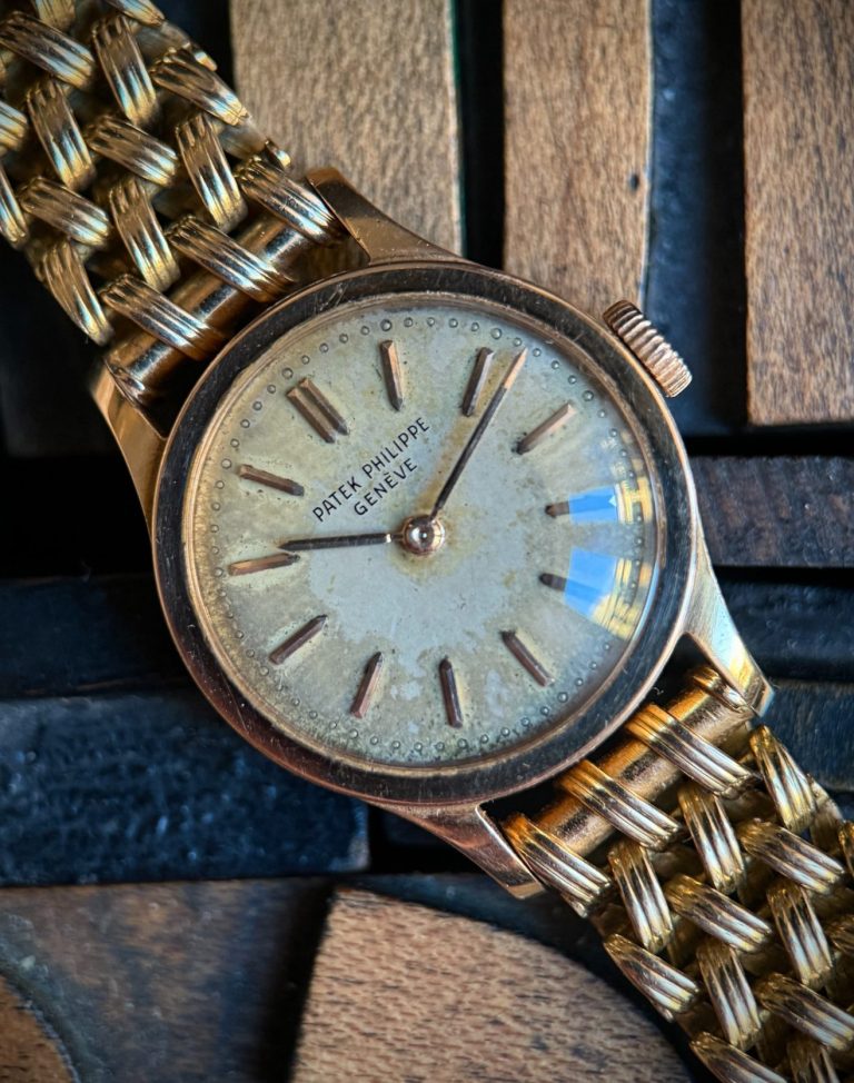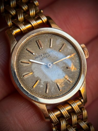 Clásico, icónico y extremadamente raro modelo de Patek Philippe en su versión de señora, el Calatrava ref. 3148, caja de oro rosa en buen estado de conservación, como puede apreciarse claramente en la profundidad y definición de los sellos originales de la caja. La esfera se conserva en estado original con una fuerte patina que le aporta carácter y autenticidad, algo muy valorado en la relojería vintage.