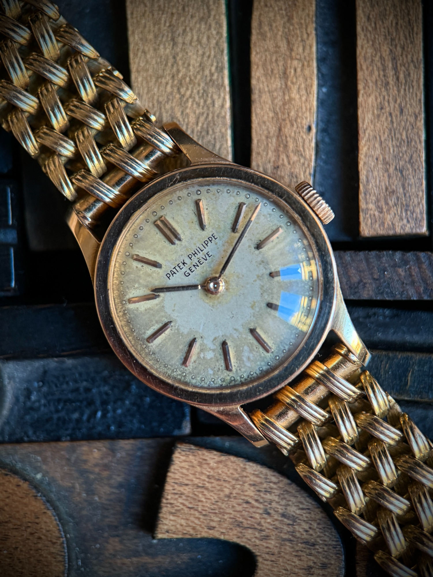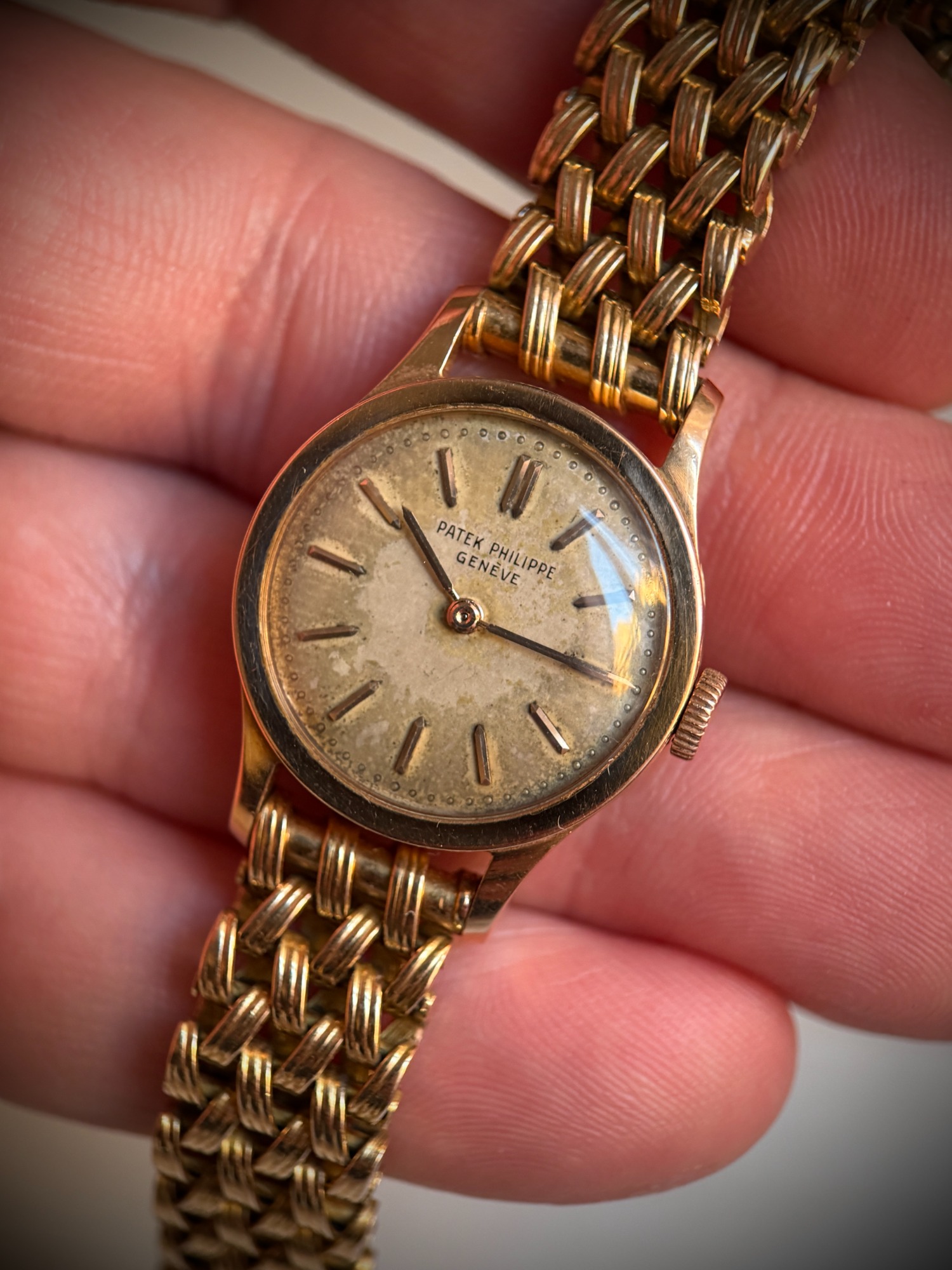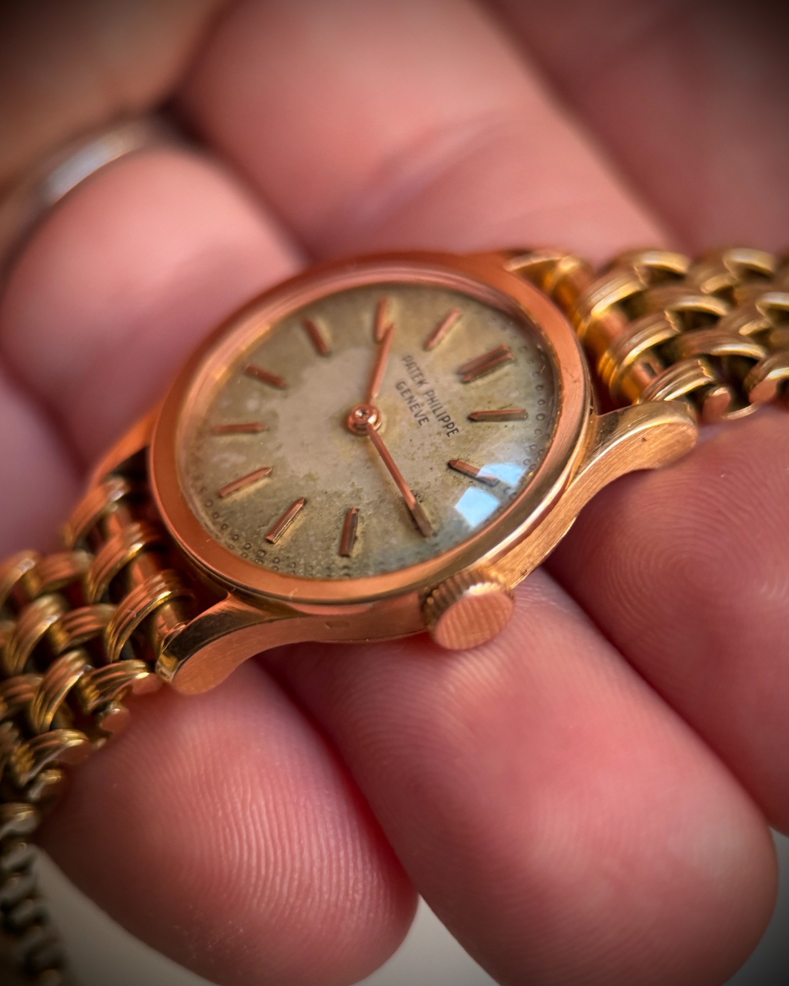 Clásico, icónico y extremadamente raro modelo de Patek Philippe en su versión de señora, el Calatrava ref. 3148, caja de oro rosa en buen estado de conservación, como puede apreciarse claramente en la profundidad y definición de los sellos originales de la caja. La esfera se conserva en estado original con una fuerte patina que le aporta carácter y autenticidad, algo muy valorado en la relojería vintage.