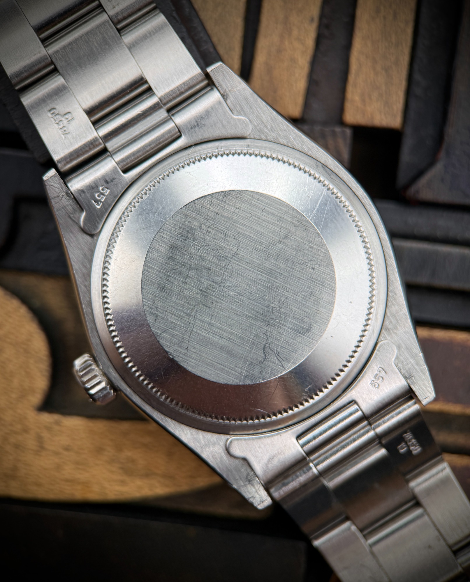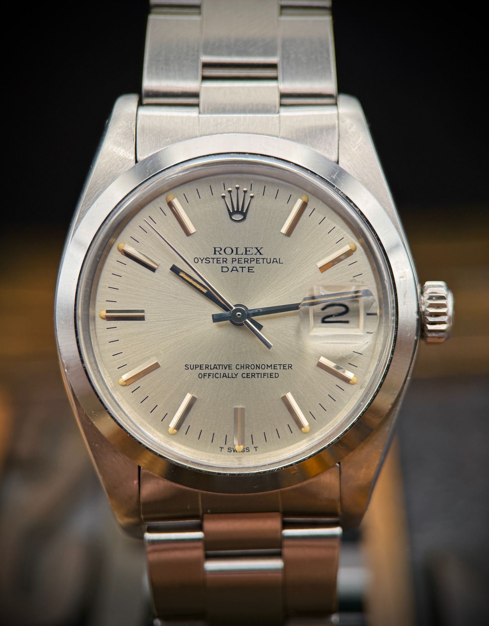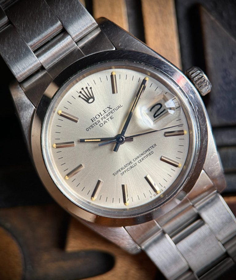 Este Rolex Date, fabricado en 1979, representa una de las configuraciones más equilibradas y versátiles de la línea Date: una caja de acero inoxidable de 34 mm, un cristal acrílico abovedado y el robusto calibre automático 1570, uno de los movimientos más respetados y antiguos de Rolex, reconocido por su fiabilidad y precisión.