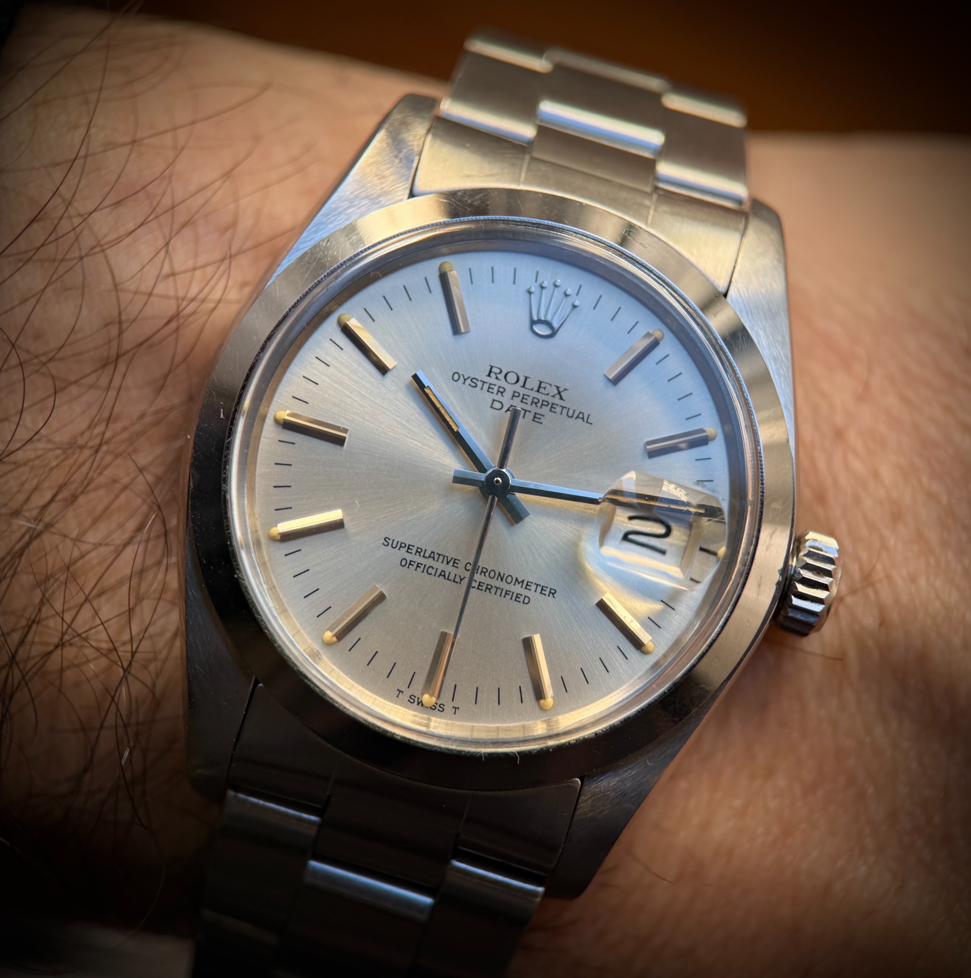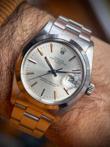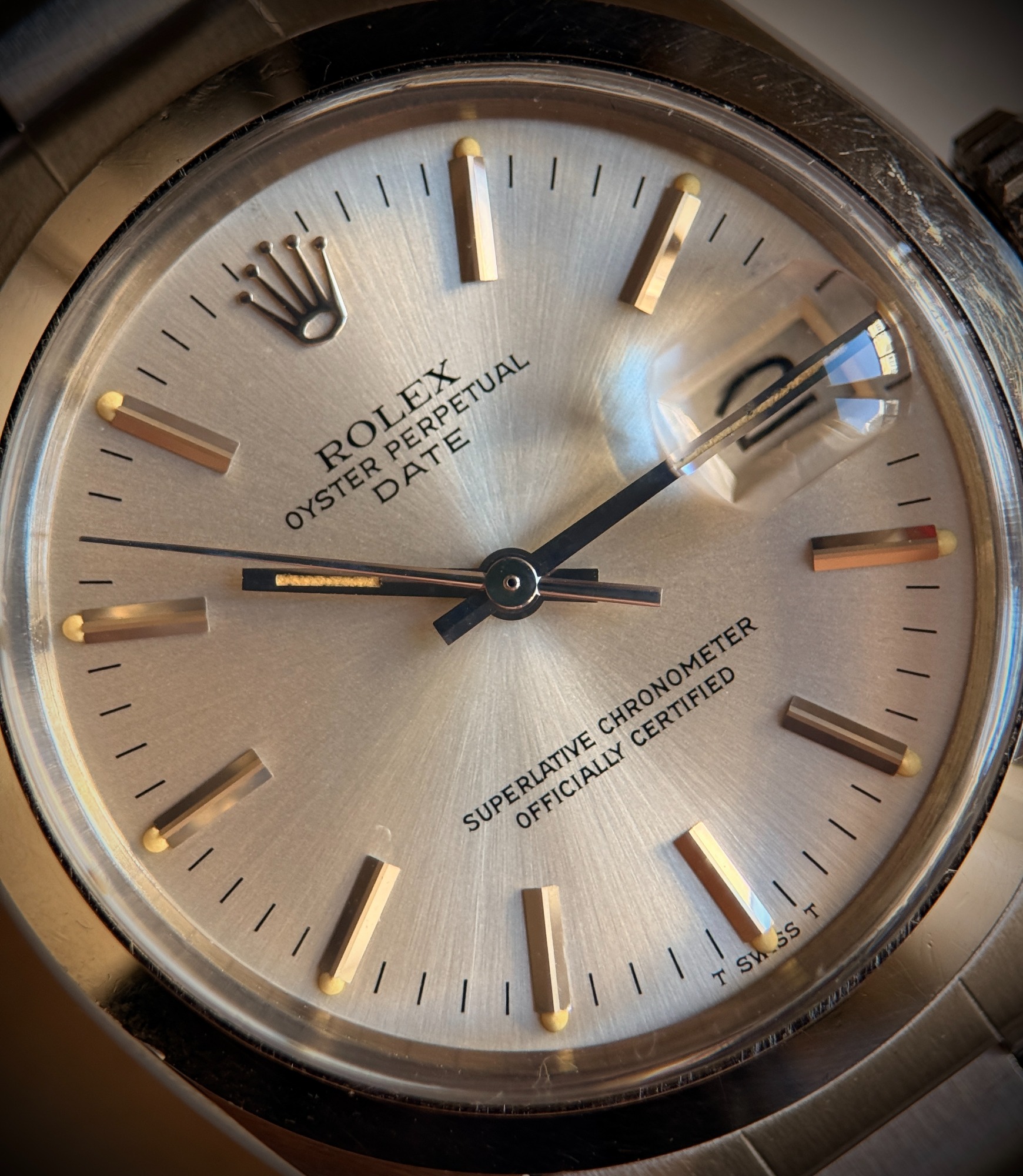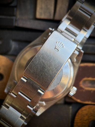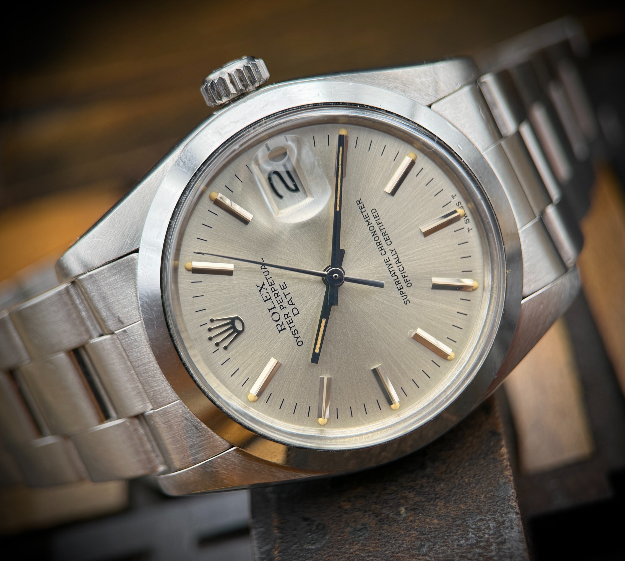 Este Rolex Date, fabricado en 1979, representa una de las configuraciones más equilibradas y versátiles de la línea Date: una caja de acero inoxidable de 34 mm, un cristal acrílico abovedado y el robusto calibre automático 1570, uno de los movimientos más respetados y antiguos de Rolex, reconocido por su fiabilidad y precisión.