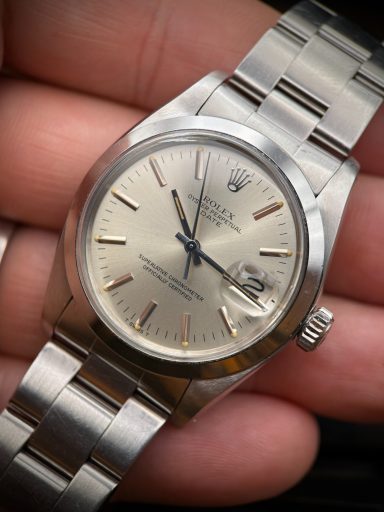 Una excelente oportunidad para coleccionistas que buscan un Rolex clásico con pátina natural, mecánica probada y el inconfundible encanto de los modelos Date con cristal acrílico de la época dorada de la marca.