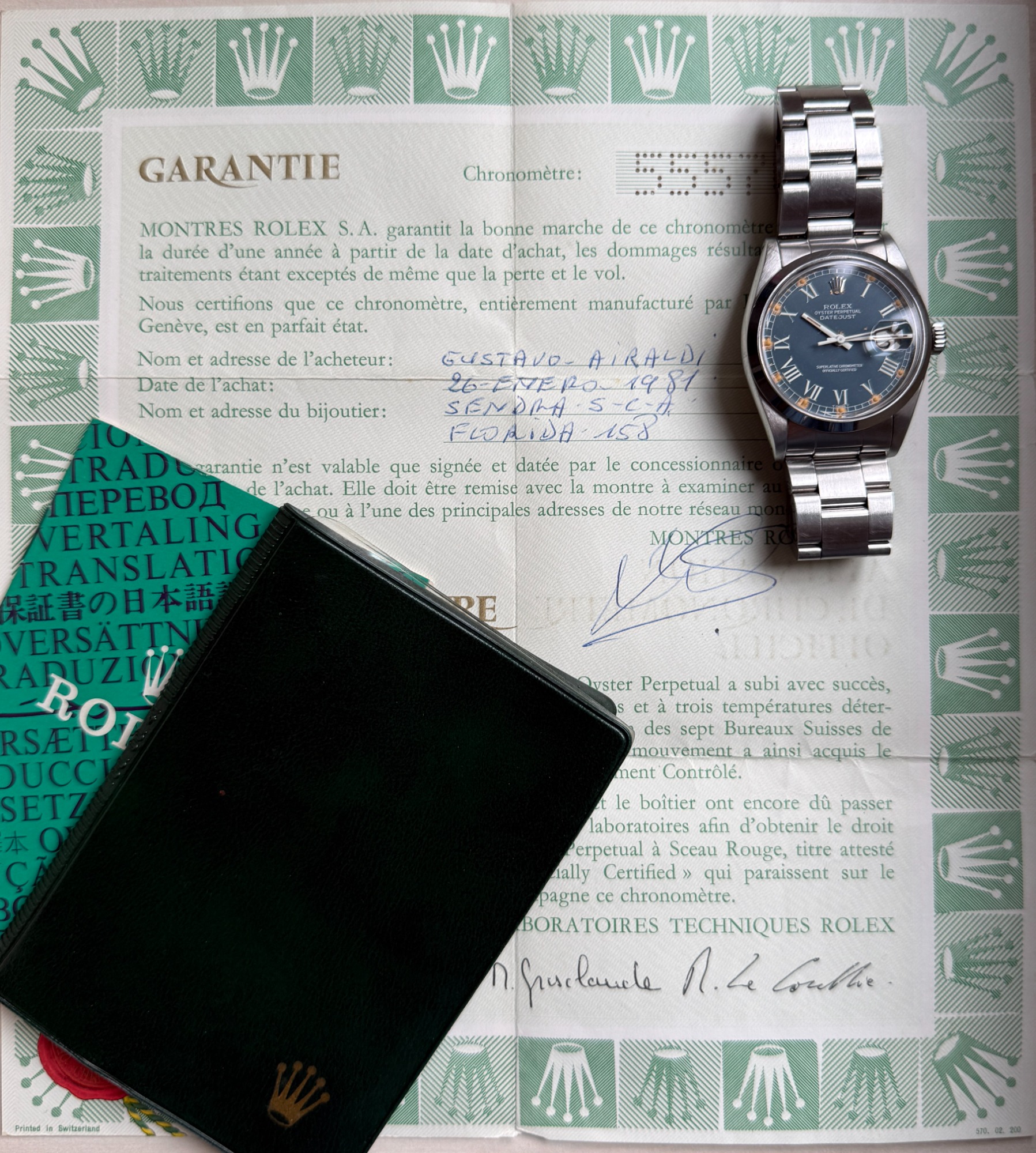 Excepcional Rolex Datejust ref. 16000 de 1981, una pieza muy coleccionable que presenta la rara y codiciada esfera azul Buckley. El reloj viene con su documentación original, lo que realza aún más su valor histórico y de colección.
