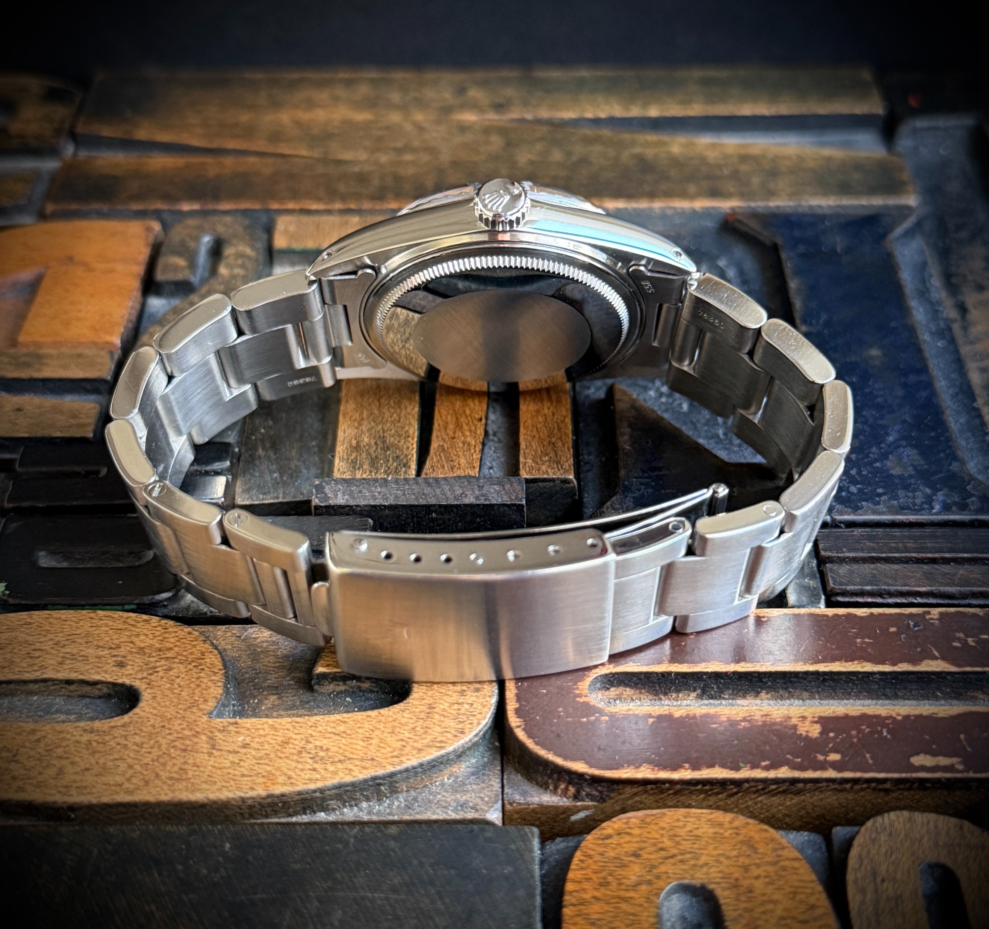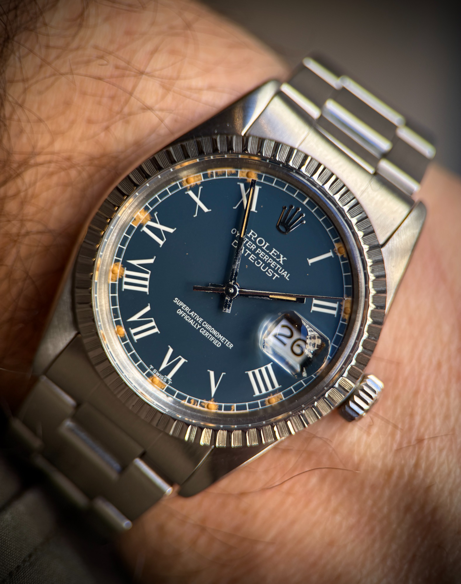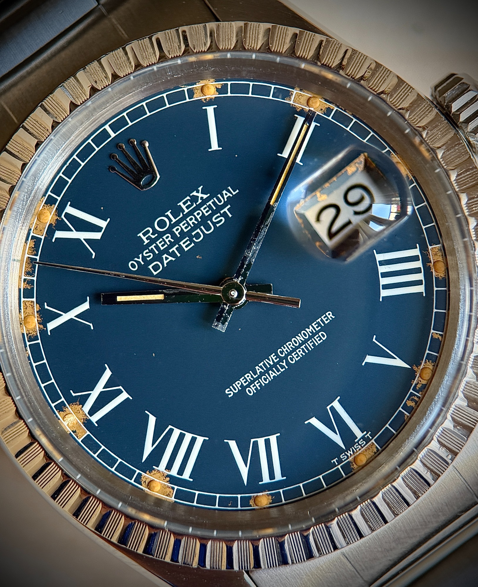La esfera muestra el envejecimiento característico de los diales azules de la época, con pérdida de pintura alrededor de los índices de tritio—un rasgo bien conocido y apreciado que refuerza su autenticidad y le aporta un atractivo visual muy distintivo.