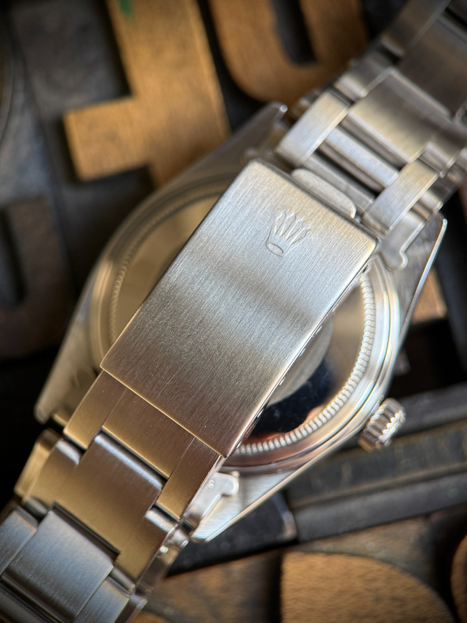 Tanto los puntos de tritio como las agujas han desarrollado con el tiempo una hermosa pátina color calabaza, que armoniza perfectamente con la decoloración natural de la esfera y acentúa su carácter vintage.