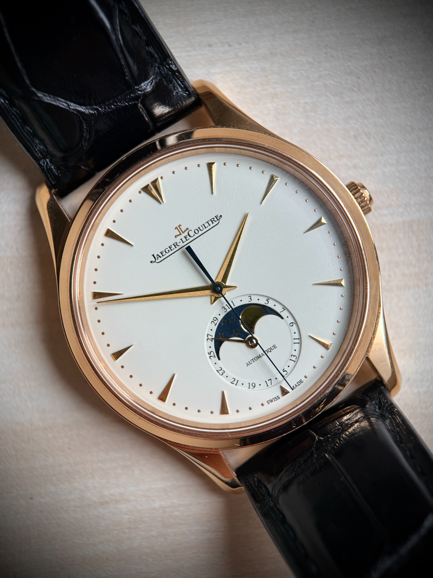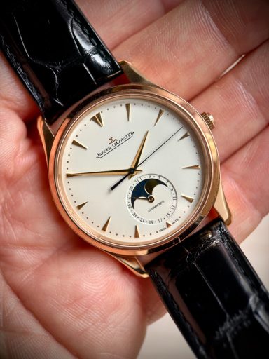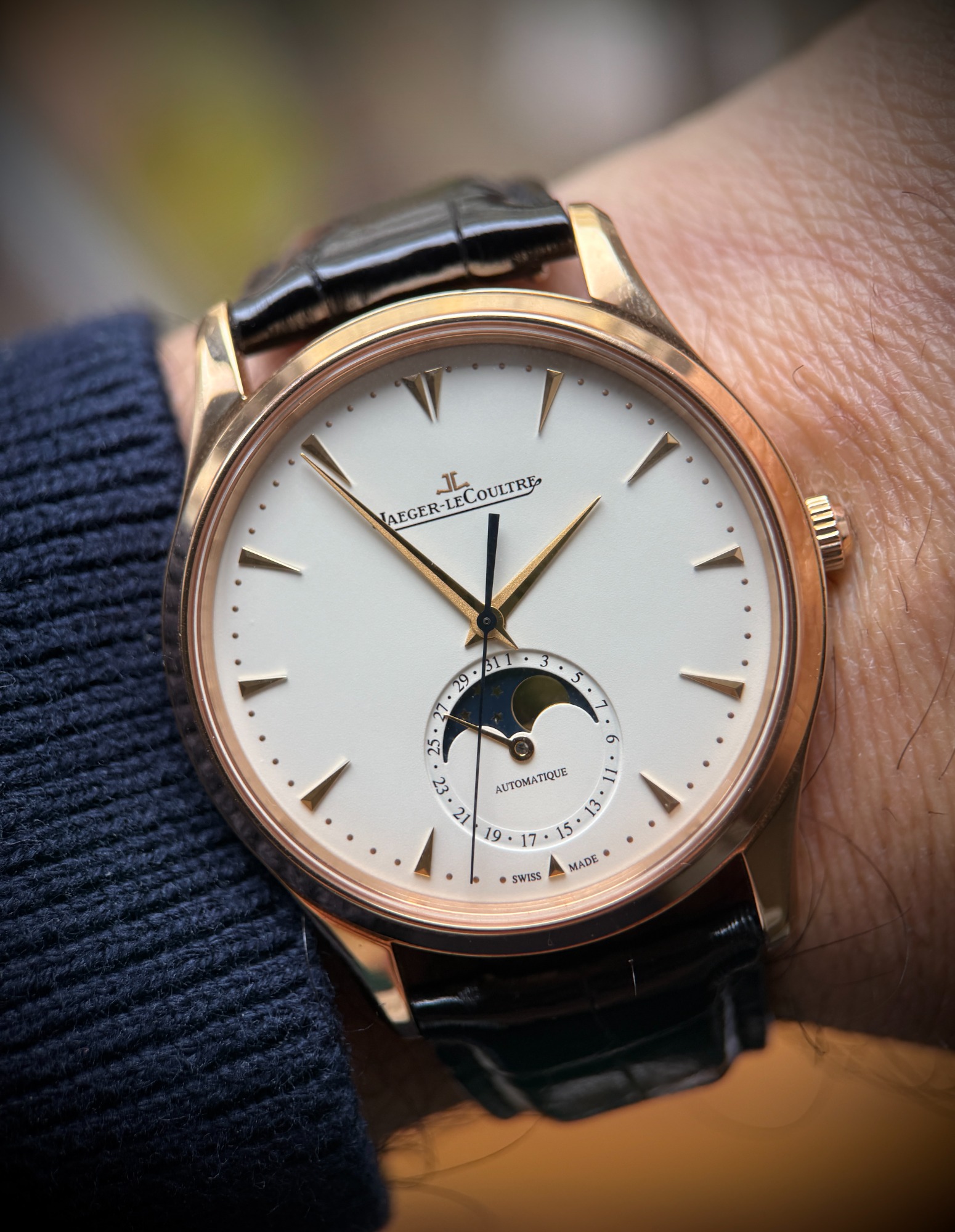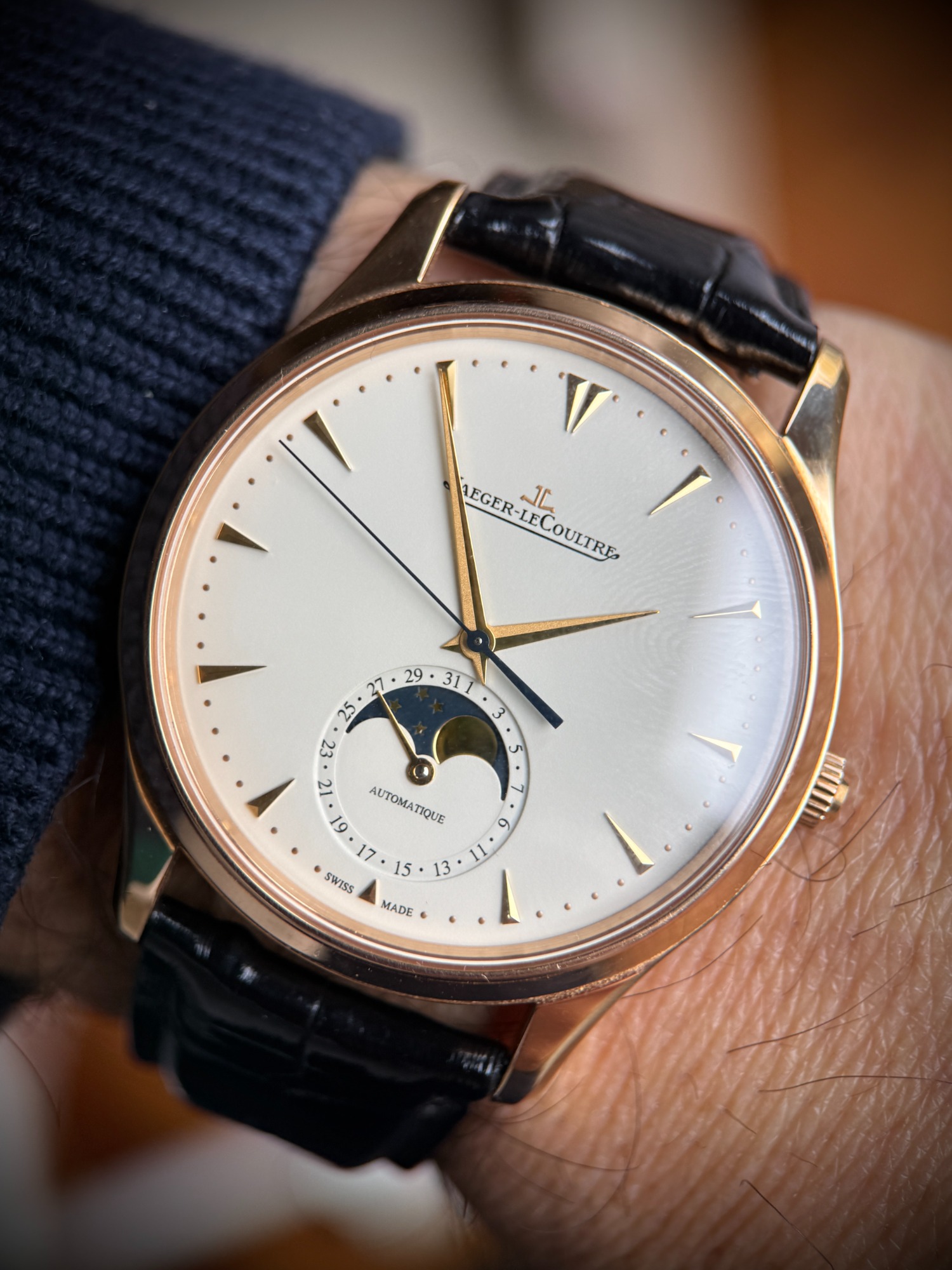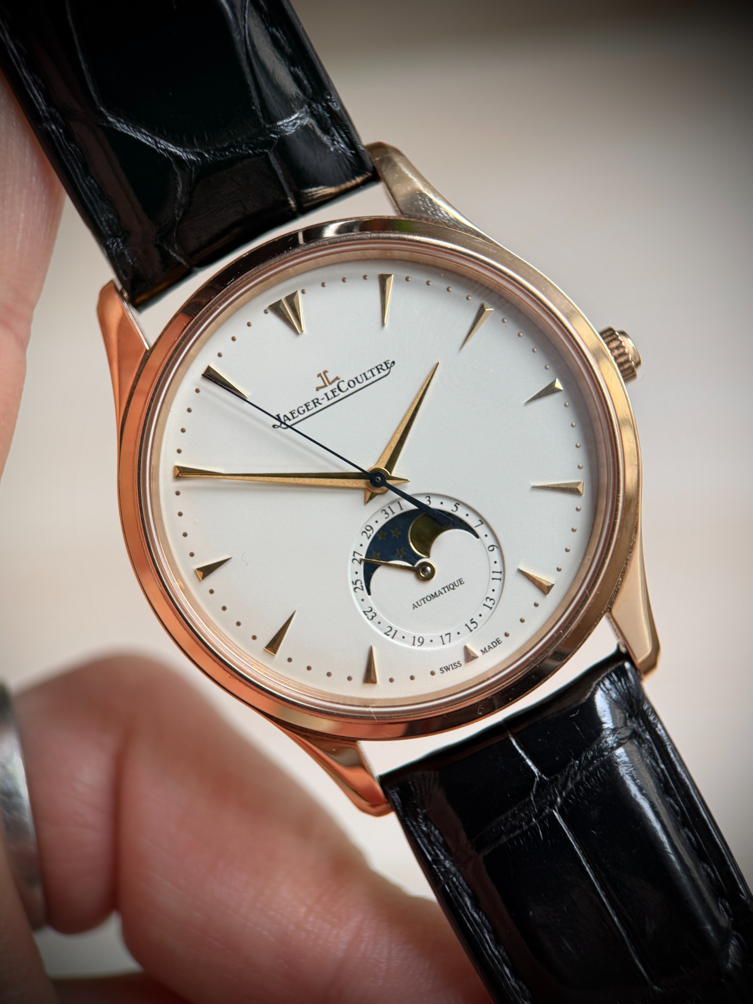 Este Master Ultra Thin Moon es un claro exponente de esa filosofía: una caja de oro rosa de líneas puras y proporciones impecables, que alberga un movimiento automático manufactura de extraordinaria finura. Su esfera, limpia y equilibrada, presenta la clásica indicación de fase lunar a las 6, una complicación poética ejecutada con la sobriedad y precisión que caracterizan a la maison.