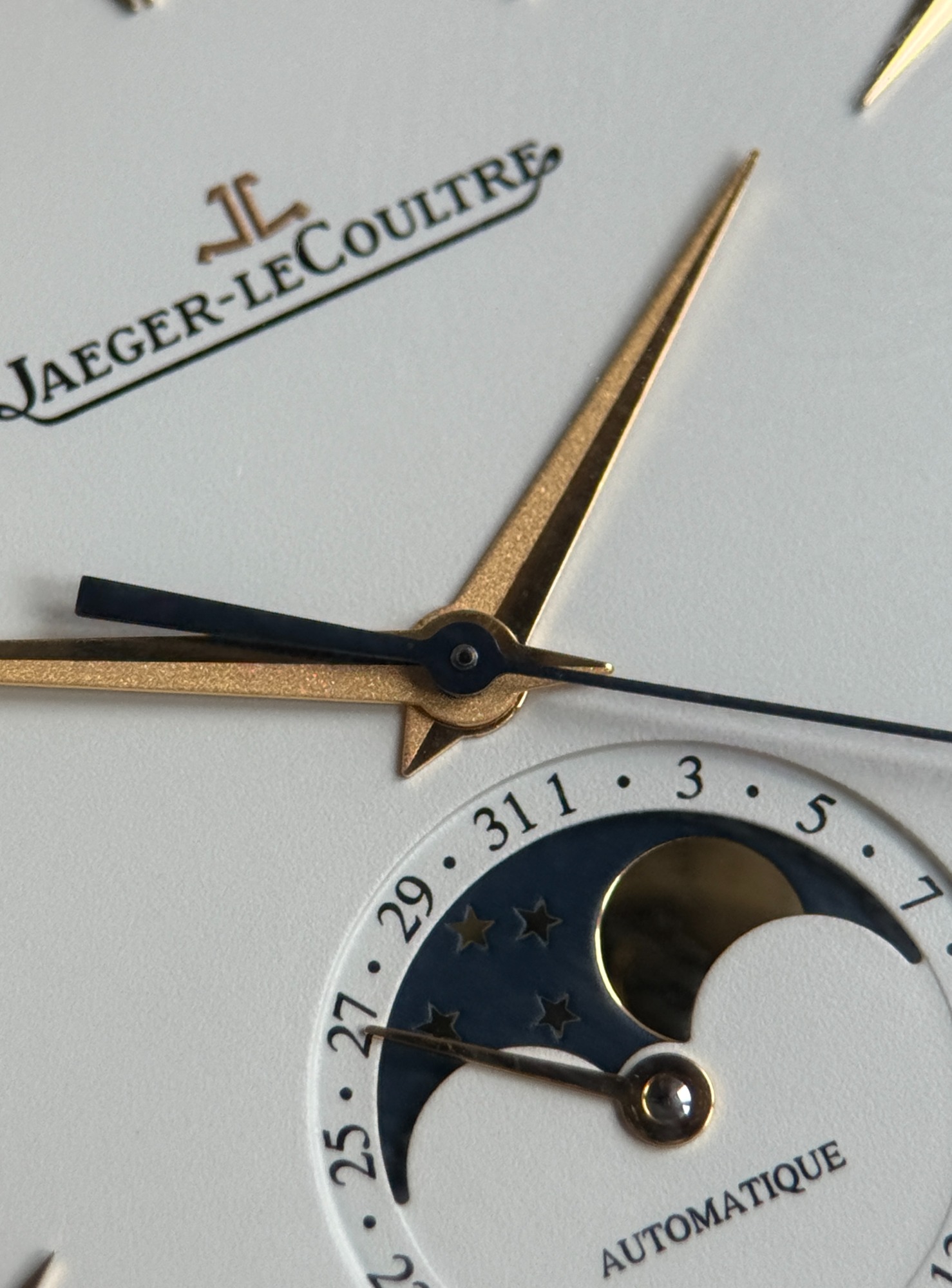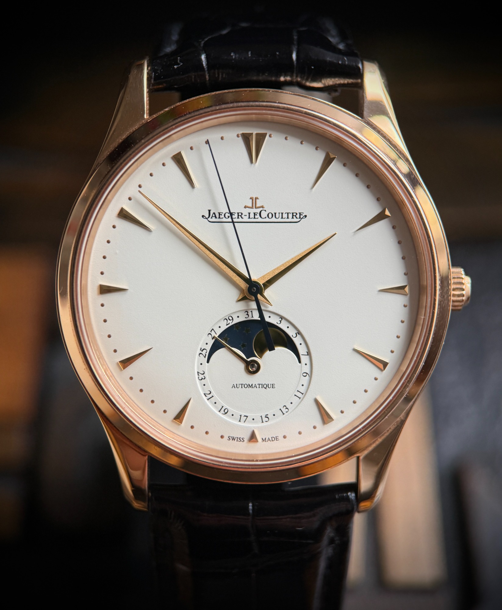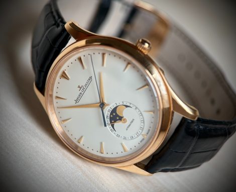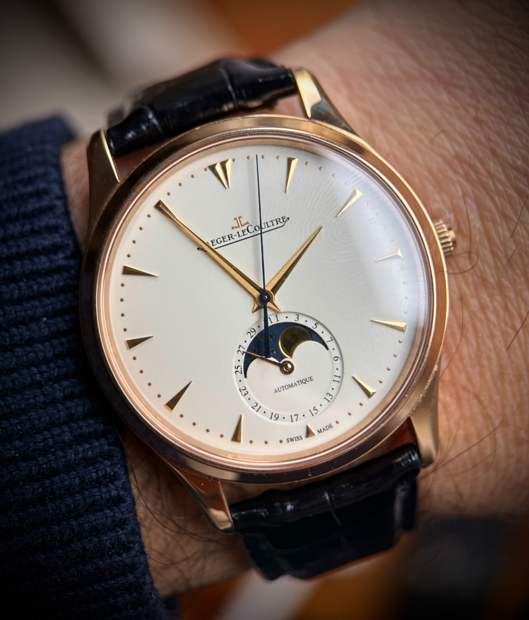 Este Master Ultra Thin Moon es un claro exponente de esa filosofía: una caja de oro rosa de líneas puras y proporciones impecables, que alberga un movimiento automático manufactura de extraordinaria finura. Su esfera, limpia y equilibrada, presenta la clásica indicación de fase lunar a las 6, una complicación poética ejecutada con la sobriedad y precisión que caracterizan a la maison.