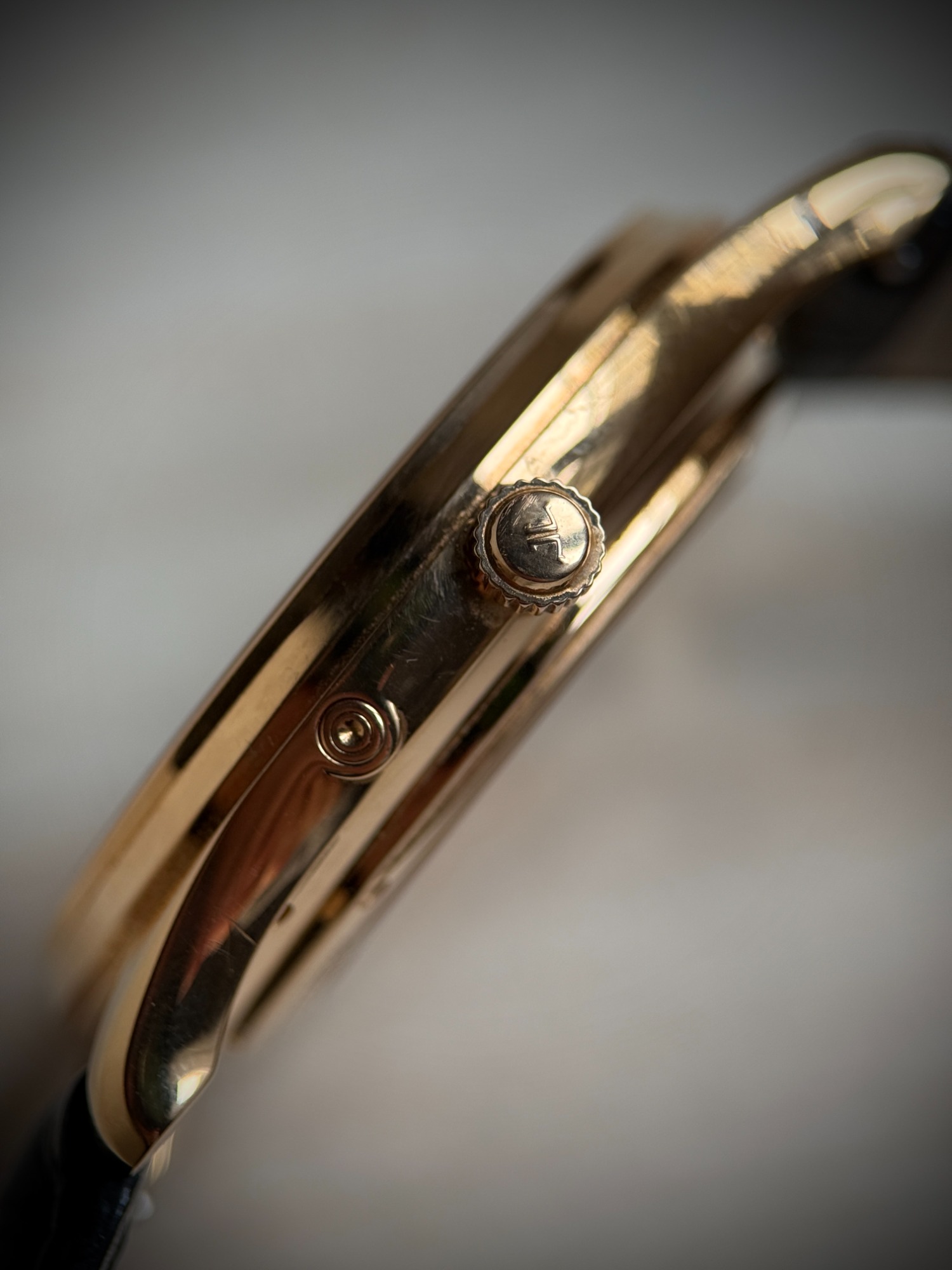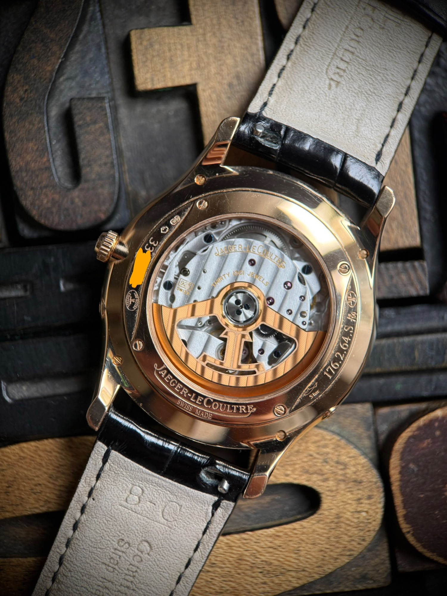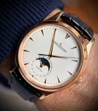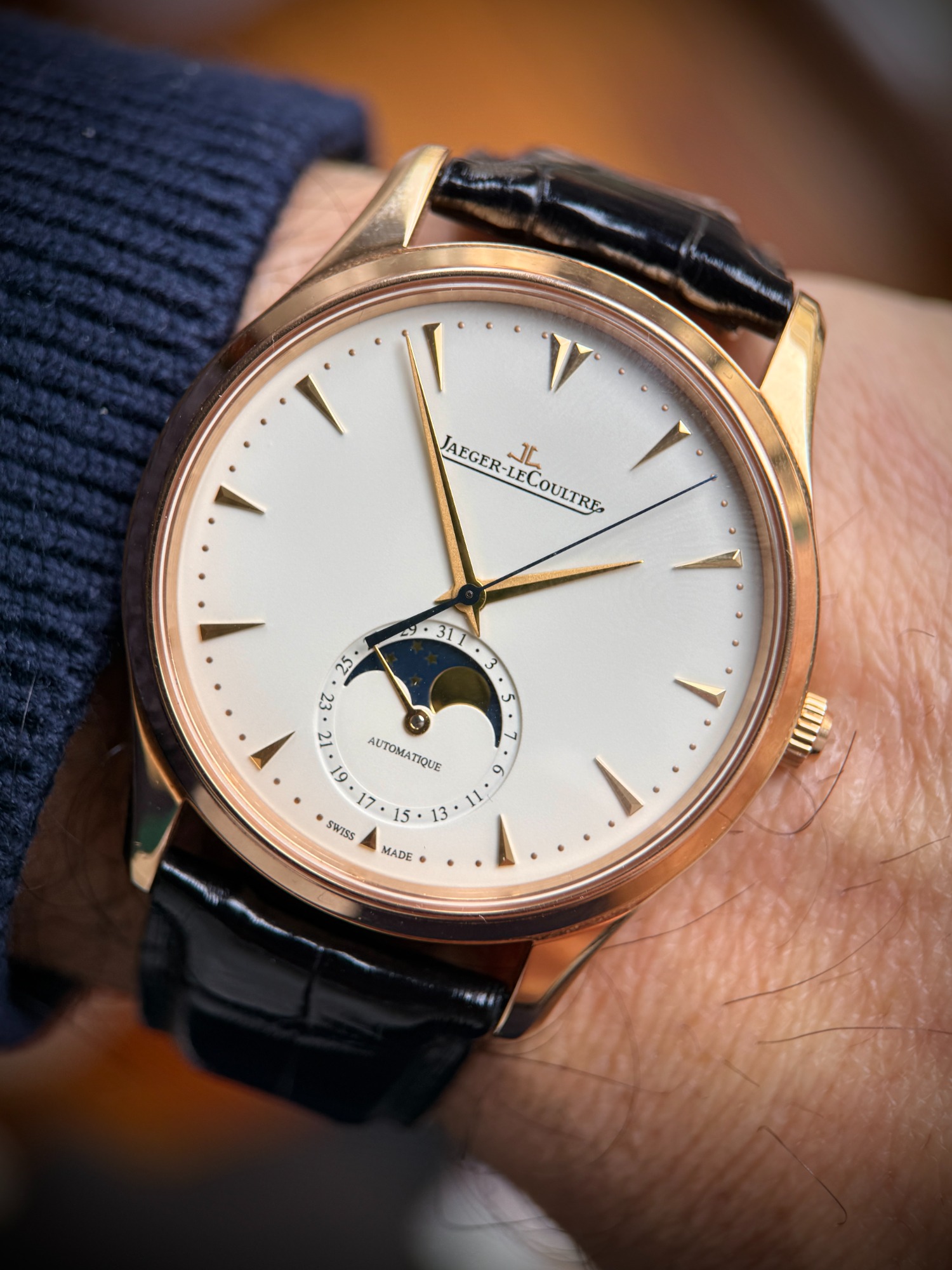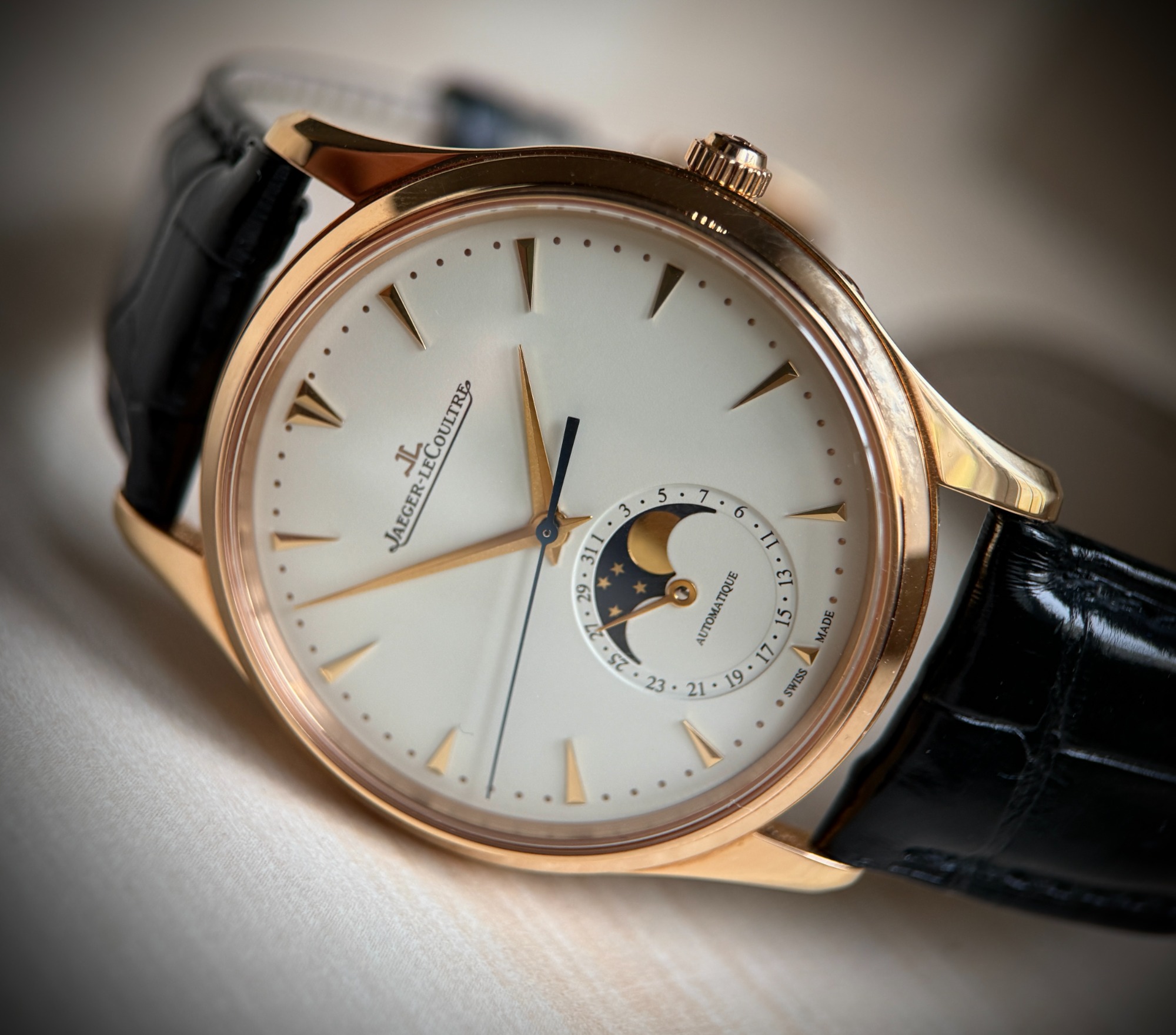 Este Master Ultra Thin Moon es un claro exponente de esa filosofía: una caja de oro rosa de líneas puras y proporciones impecables, que alberga un movimiento automático manufactura de extraordinaria finura. Su esfera, limpia y equilibrada, presenta la clásica indicación de fase lunar a las 6, una complicación poética ejecutada con la sobriedad y precisión que caracterizan a la maison.