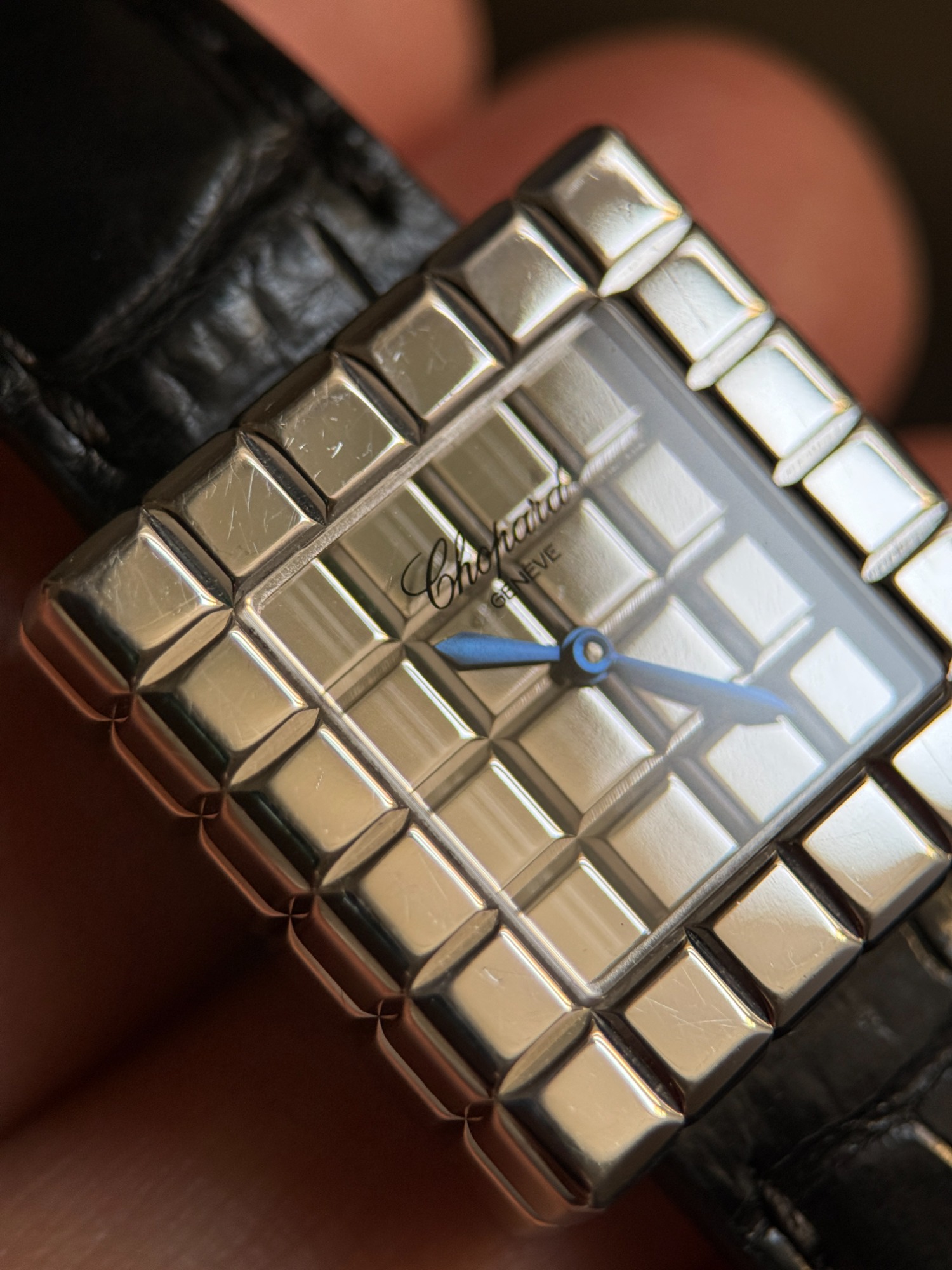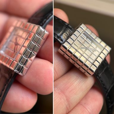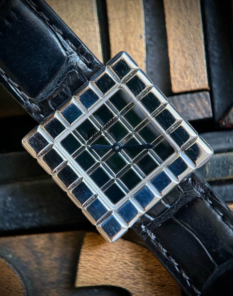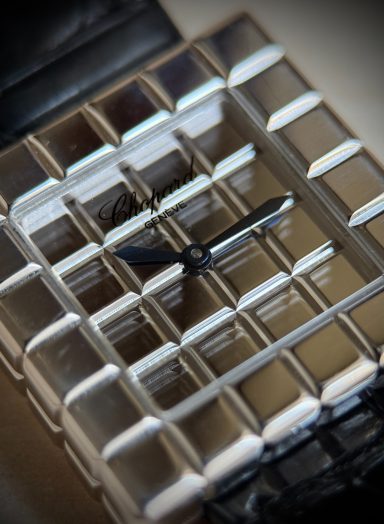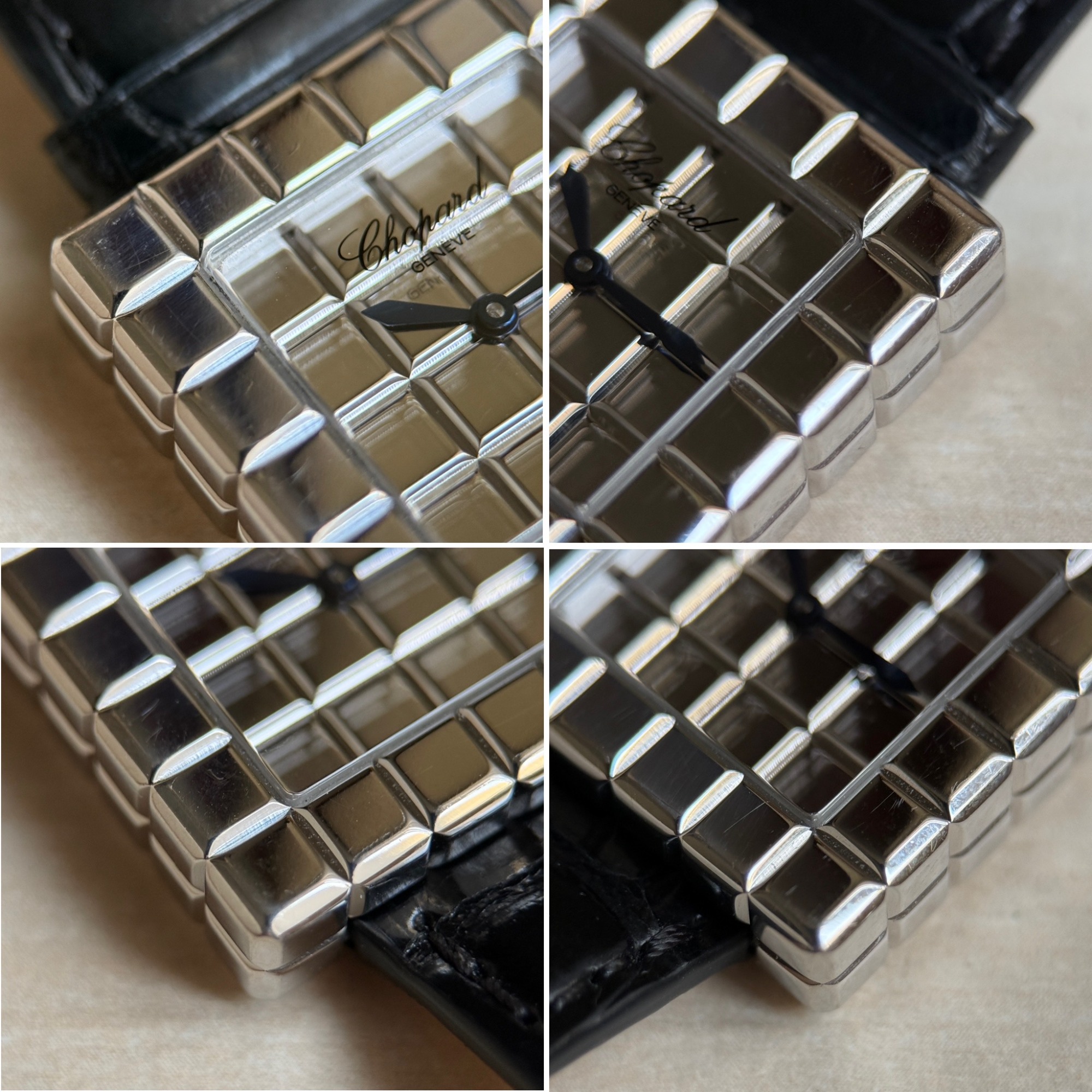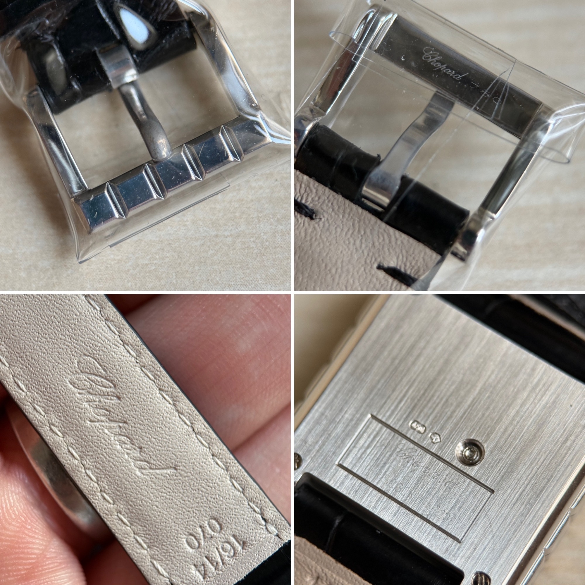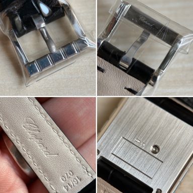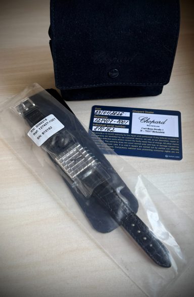 El reloj fue revisado recientemente en servicio oficial Chopard, se adjunta tarjeta de la garantía de la revisión y estuche de viaje. El reloj nunca fue pulido, por lo que presenta ligeras marcas de un uso escaso, y la correa está prácticamente nueva.