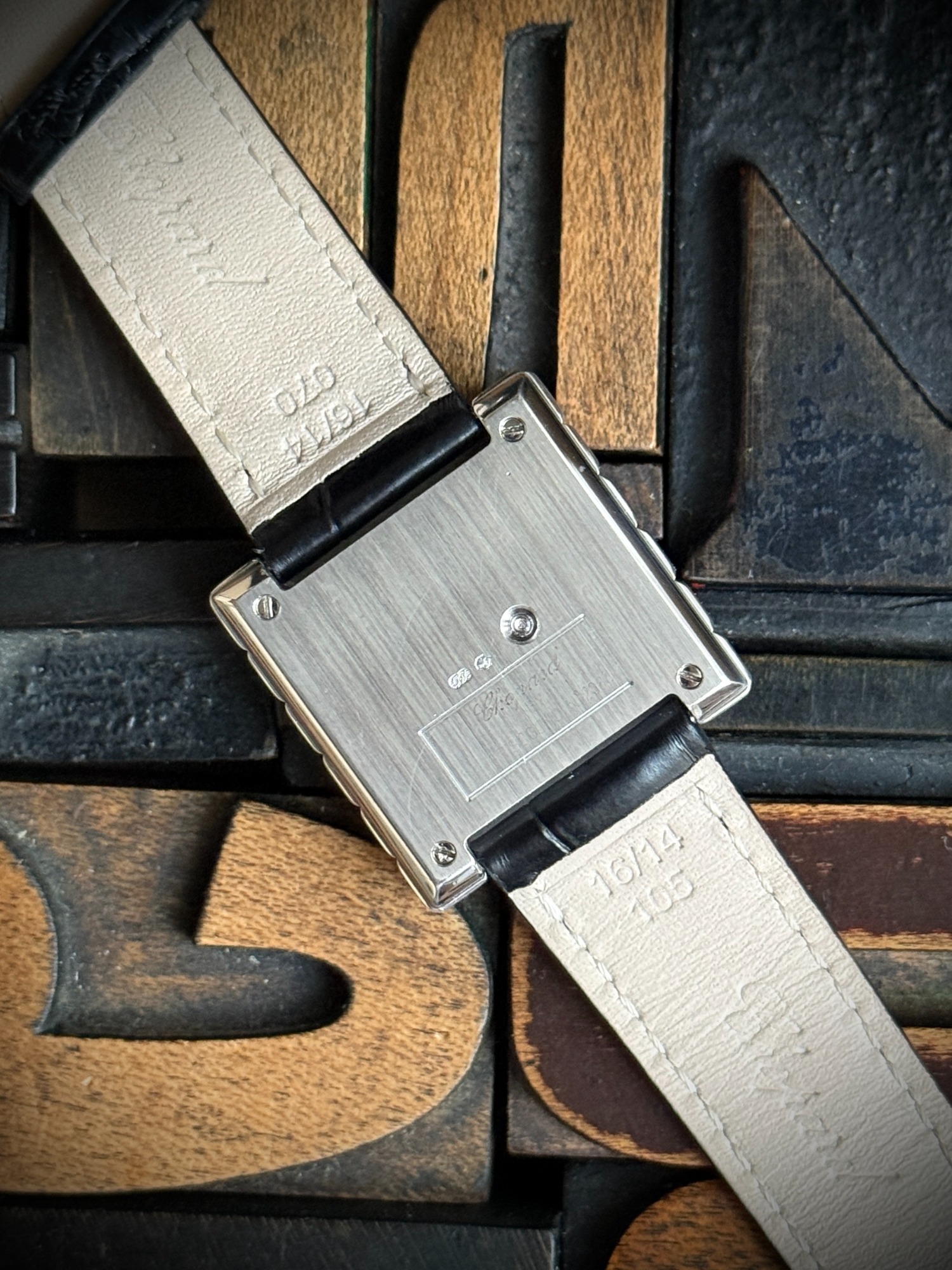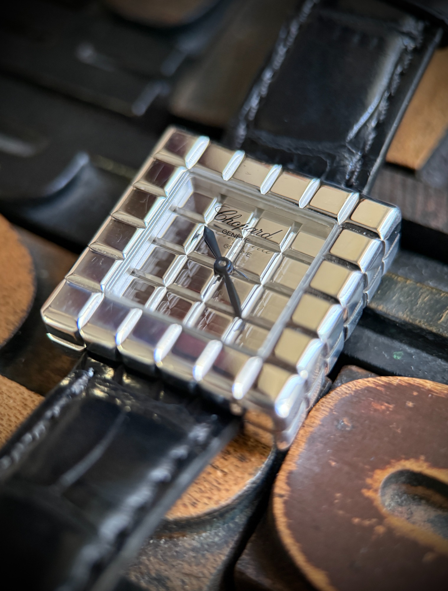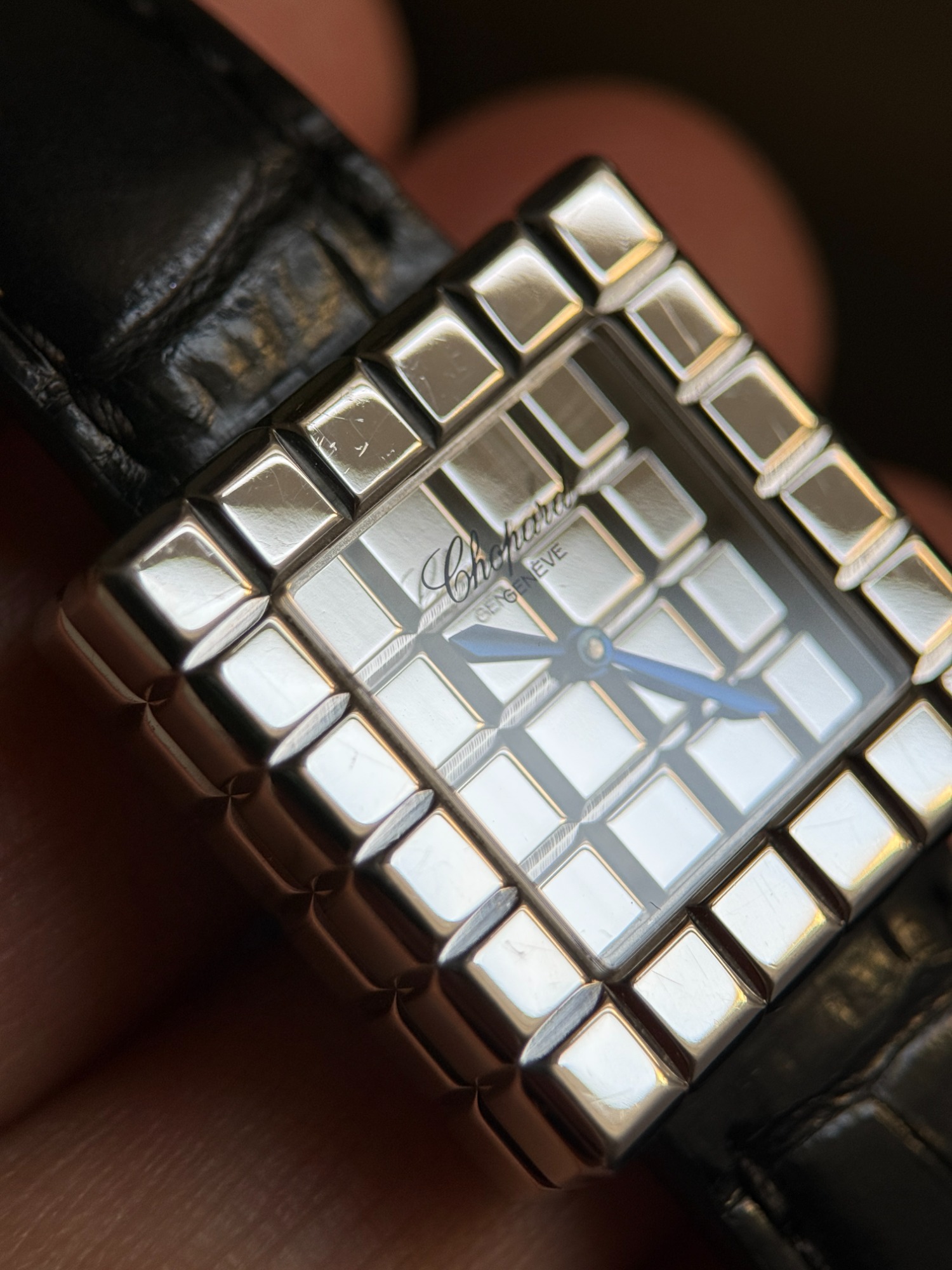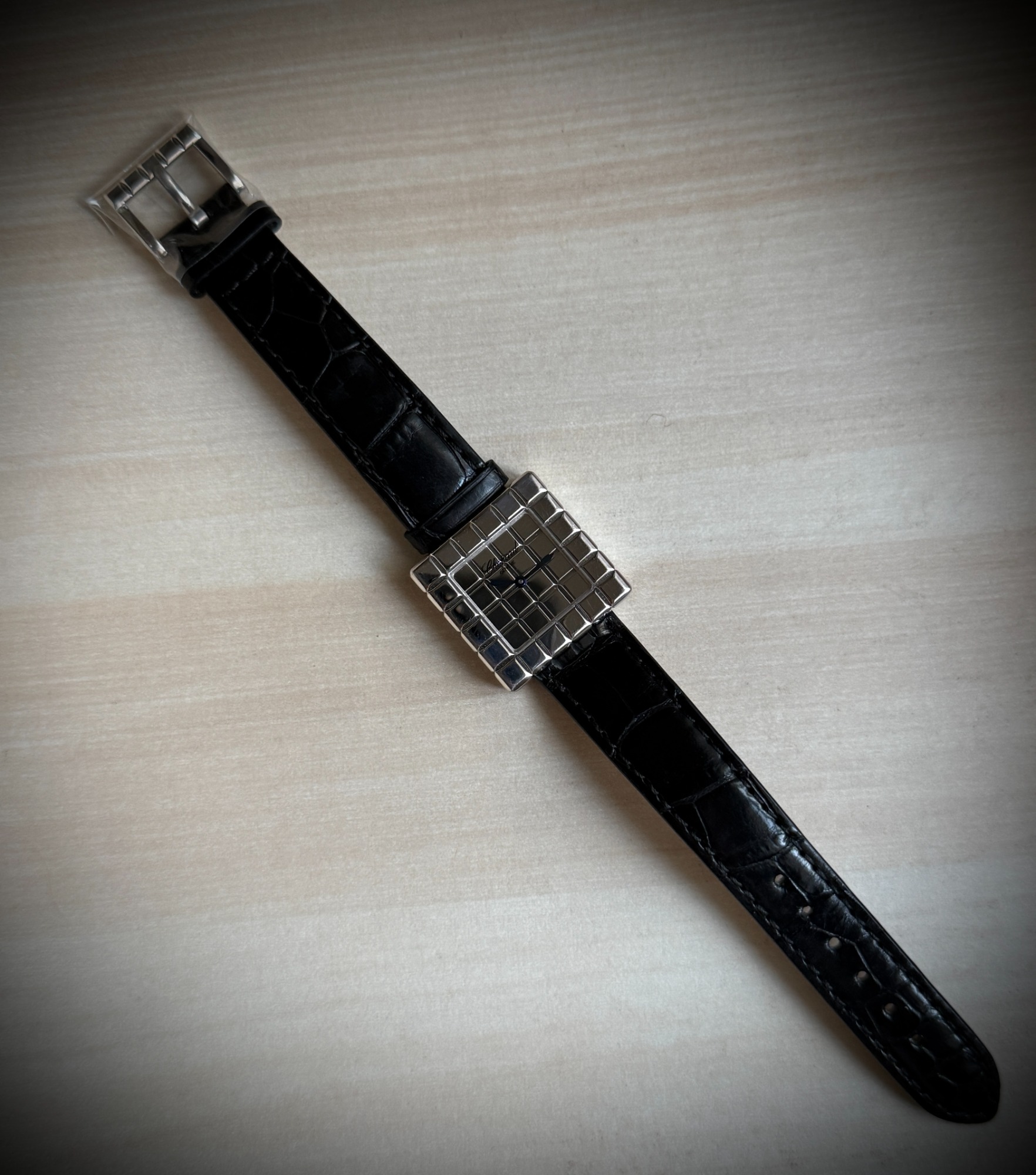 El reloj fue revisado recientemente en servicio oficial Chopard, se adjunta tarjeta de la garantía de la revisión y estuche de viaje. El reloj nunca fue pulido, por lo que presenta ligeras marcas de un uso escaso, y la correa está prácticamente nueva.