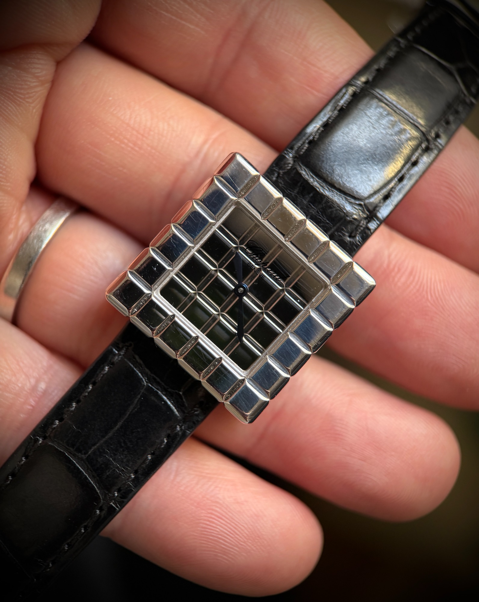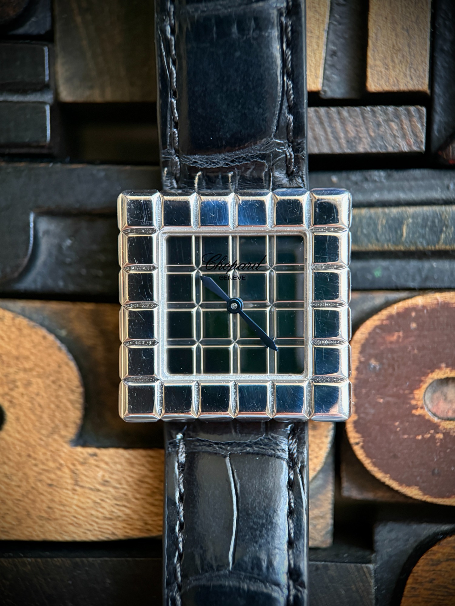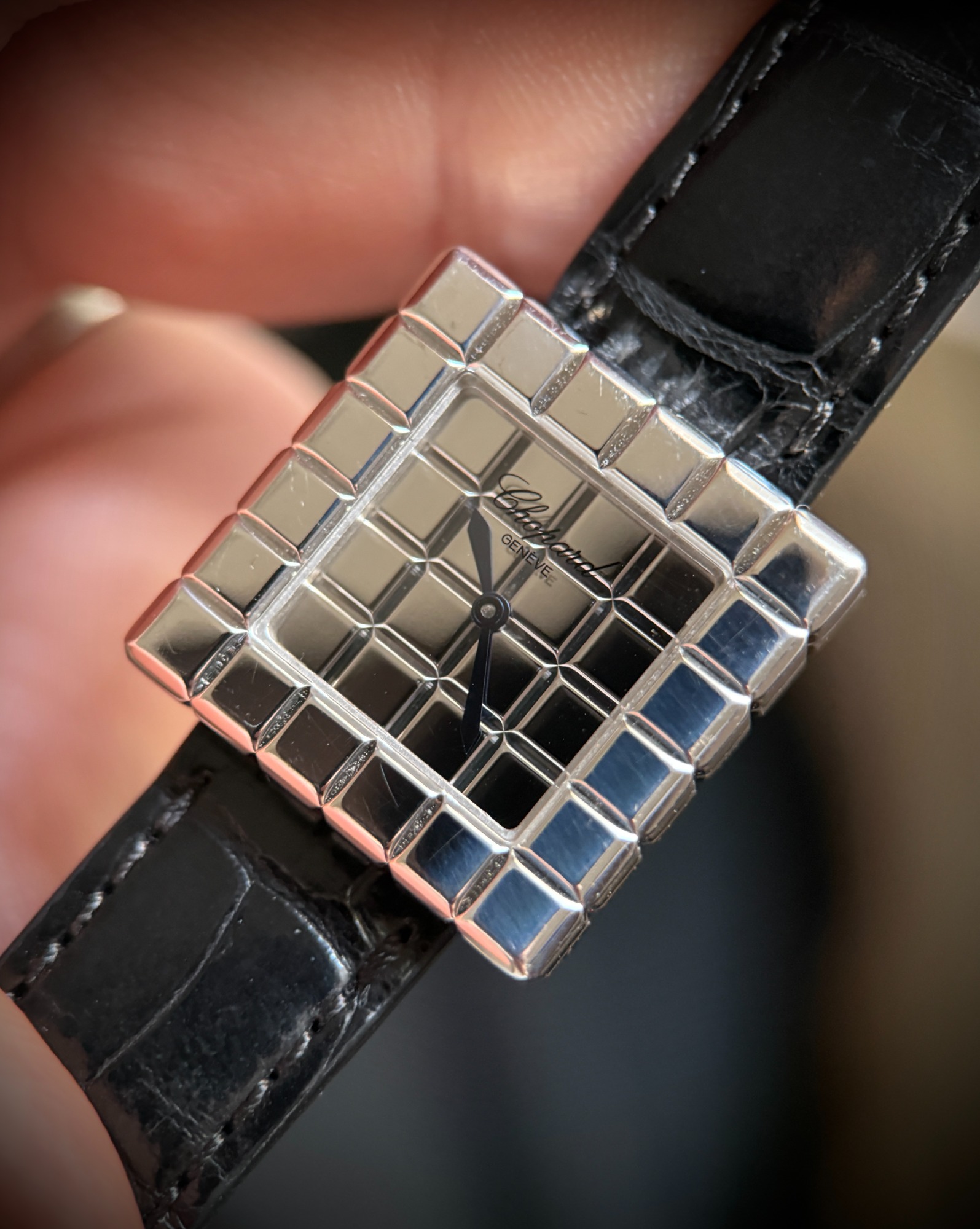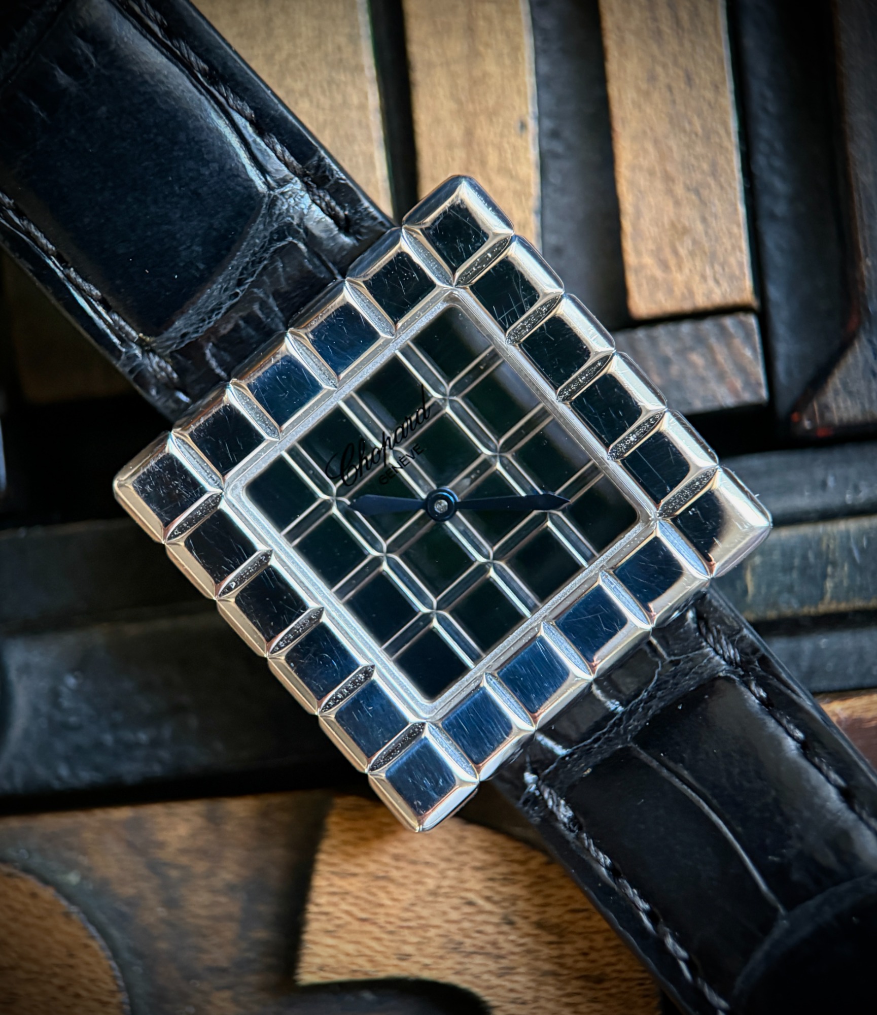 El reloj fue revisado recientemente en servicio oficial Chopard, se adjunta tarjeta de la garantía de la revisión y estuche de viaje. El reloj nunca fue pulido, por lo que presenta ligeras marcas de un uso escaso, y la correa está prácticamente nueva.