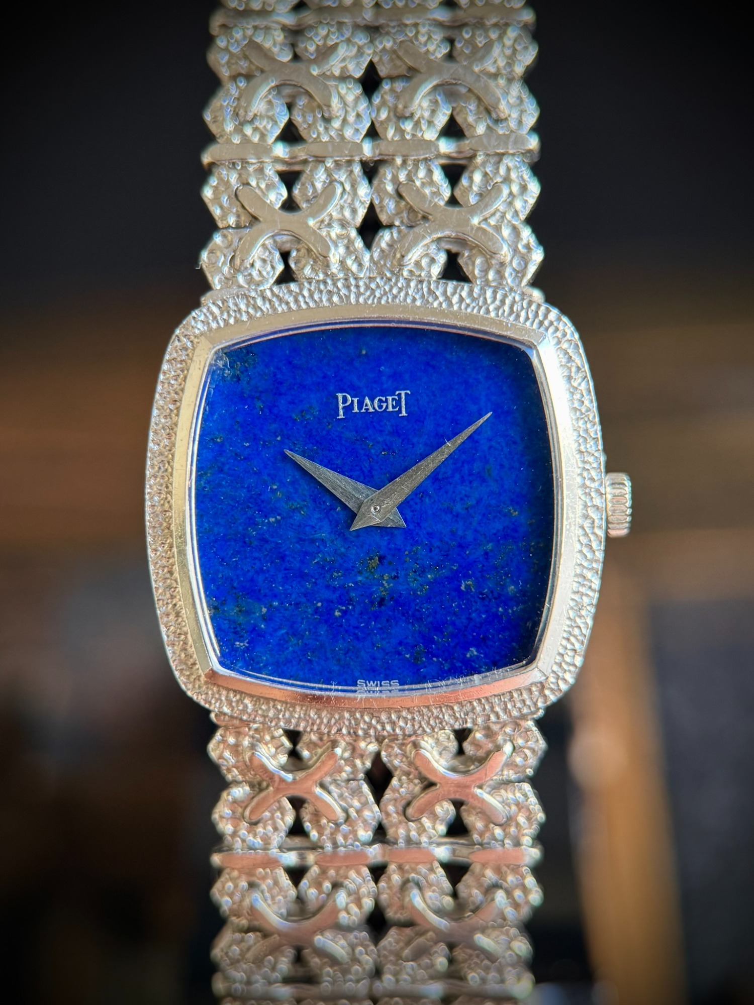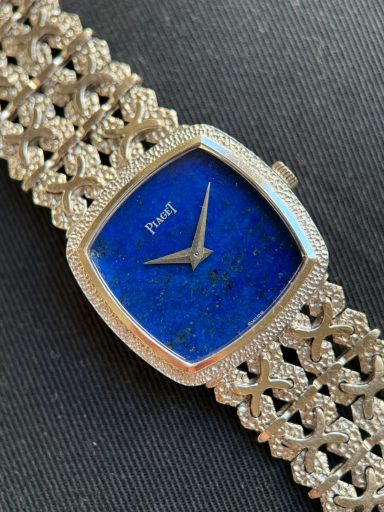 En venta Piaget Black Tie Emperador Ref. 9231 P 27, modelo icónico de la casa Piaget con movimiento manual y brazalete de oro blanco integrado a la caja, con una imponente esfera de piedra lapislázuli con un azul intenso.